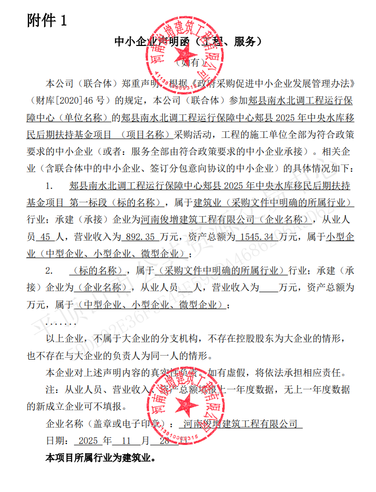 【平公资采20251098号】郏县南水北调工程运行保障中心郏县2025年中央水库移民后期扶持基金项目、第一标段-成交公告