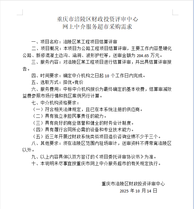 服务内容 | 对涪陵区某工程项目进行结算评审,并出具结算评审报告。 |