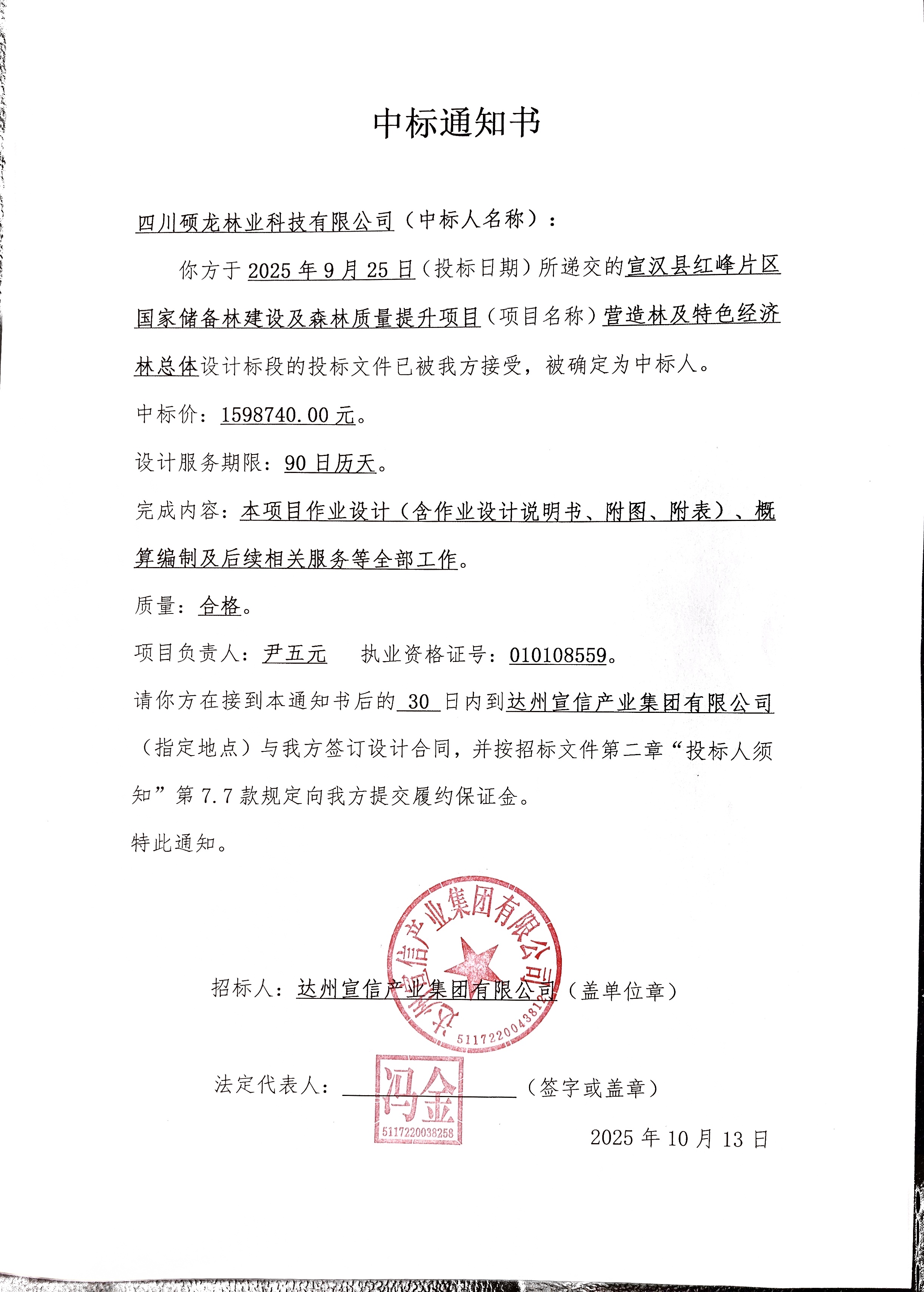 宣汉县红峰片区国家储备林建设及森林质量提升项目营造林及特色经济林总体设计/设计中标结果公告