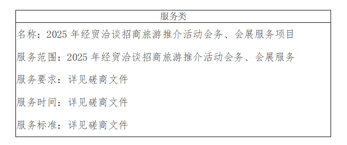 二、项目名称:2025年经贸洽谈招商旅游推介活动会务、会展服务项目