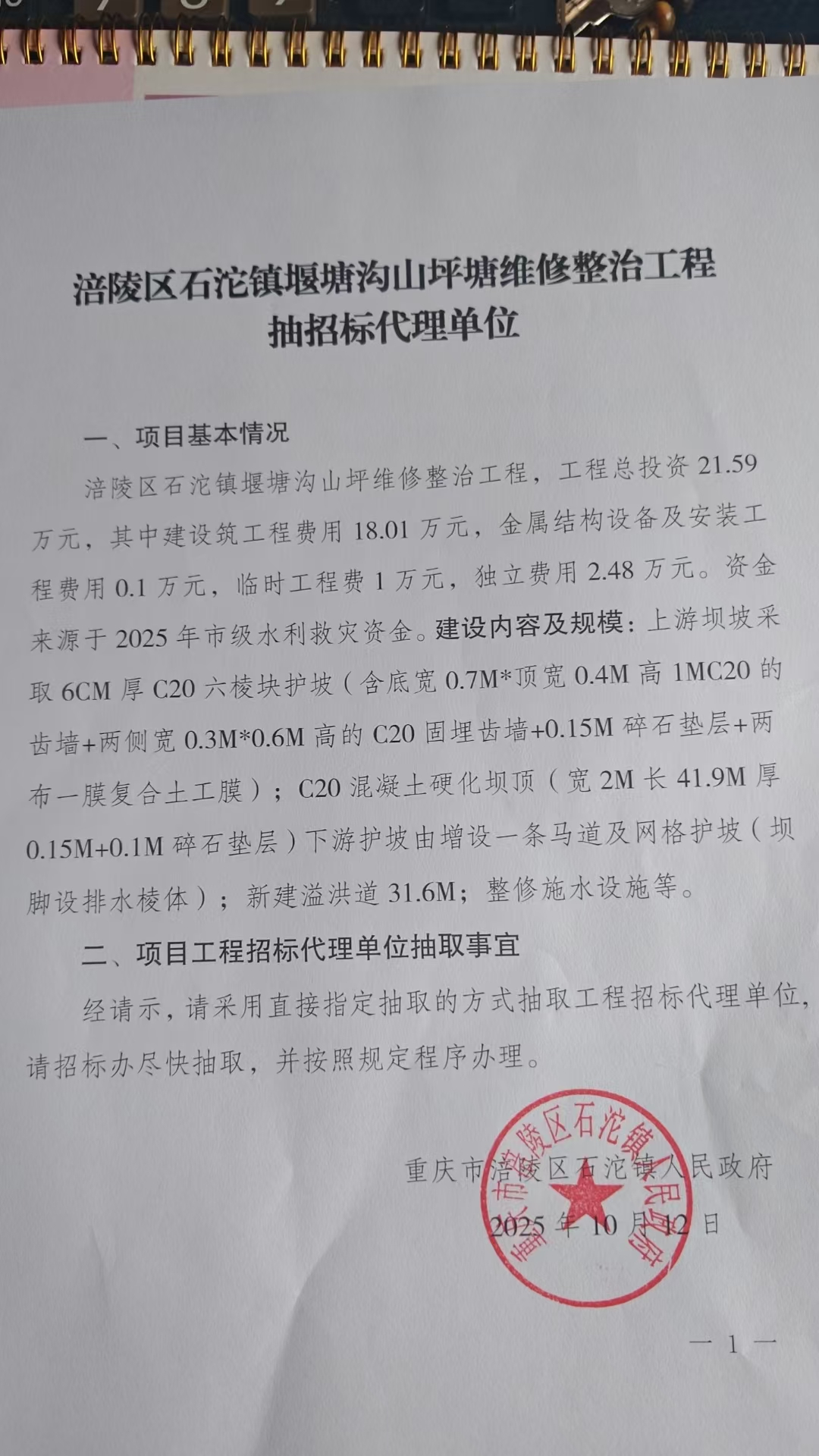 关于为【涪陵区石沱镇堰塘沟山坪塘维修整治工程】 公开选取【工程招标代理】机构的公告